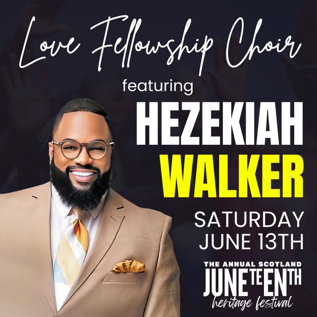 Come celebrate the Opening Night of the Annual Scotland Juneteenth Heritage Festival, Montgomery County’s premiere Black cultural event showcasing outstanding national and local musical artists. This year's celebration is headlined by Grammy Award winning gospel singer Hezekiah Walker along with his Love Fellowship Choir. Also an opening performance by local talent as well as appearances by county political, business and community leaders.